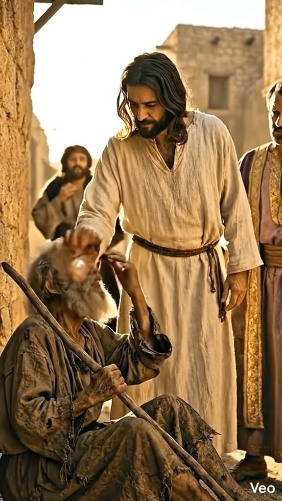 El hombre sonrió con compasión y colocó suavemente su mano sobre los ojos del anciano. En ese instante ocurrió lo imposible. La oscuridad desapareció por completo. El mendigo abrió los ojos temblando y vio por primera vez los colores, las personas… y el rostro de Jesús frente a él.